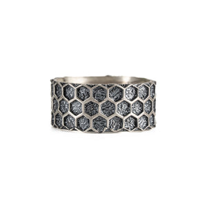 Handcrafted honeycomb ring featuring precise hexagonal motifs and polished contrasts, expertly finished in 925 sterling silver for durable lustre and refined wearability, ideal as a statement band or wedding ring.