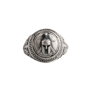 Handmade Spartan signet ring crafted in 925 sterling silver with oxidized detailing, bold Leonidas helmet and shield motifs, substantial weight and refined finish for enduring, confident daily wear.