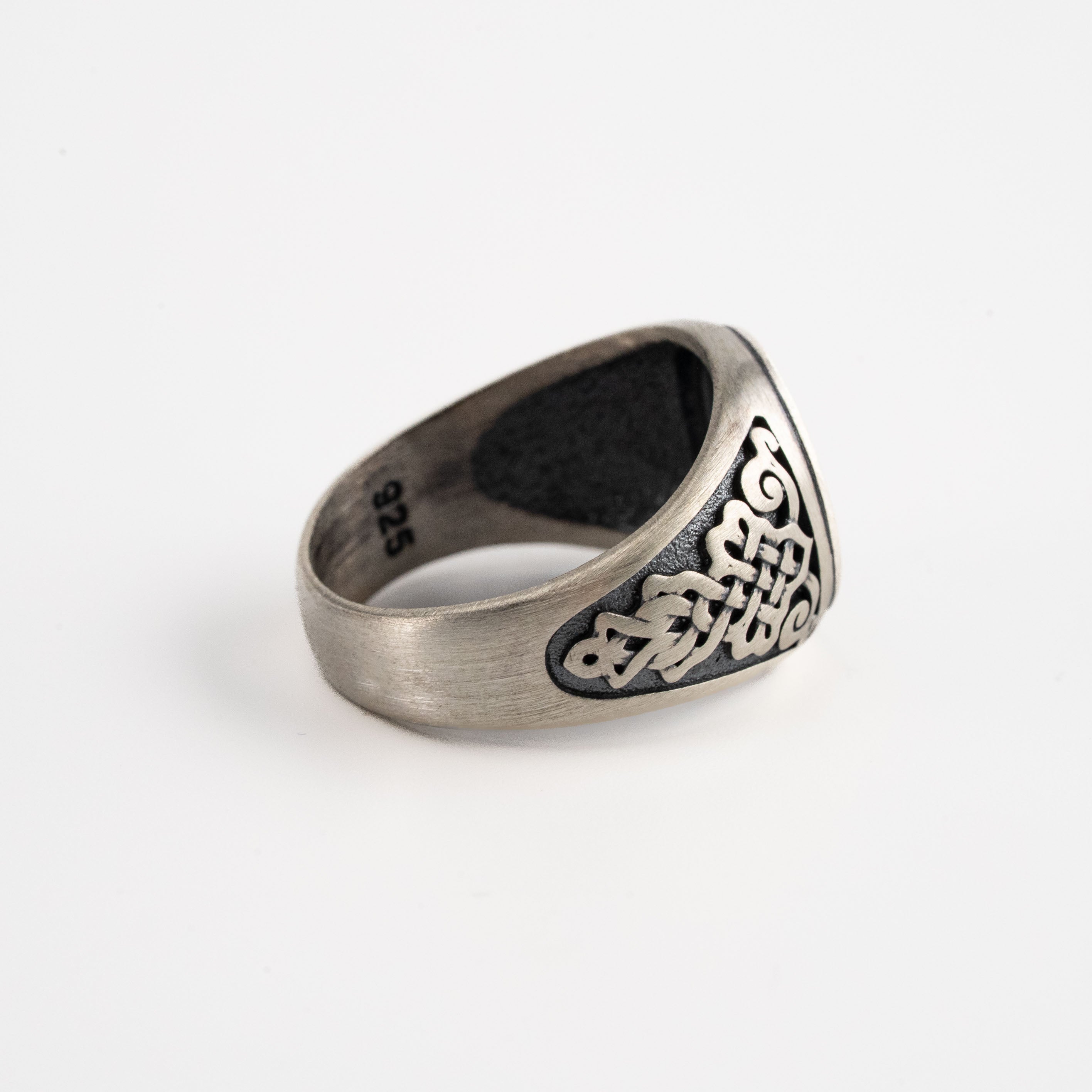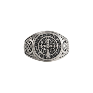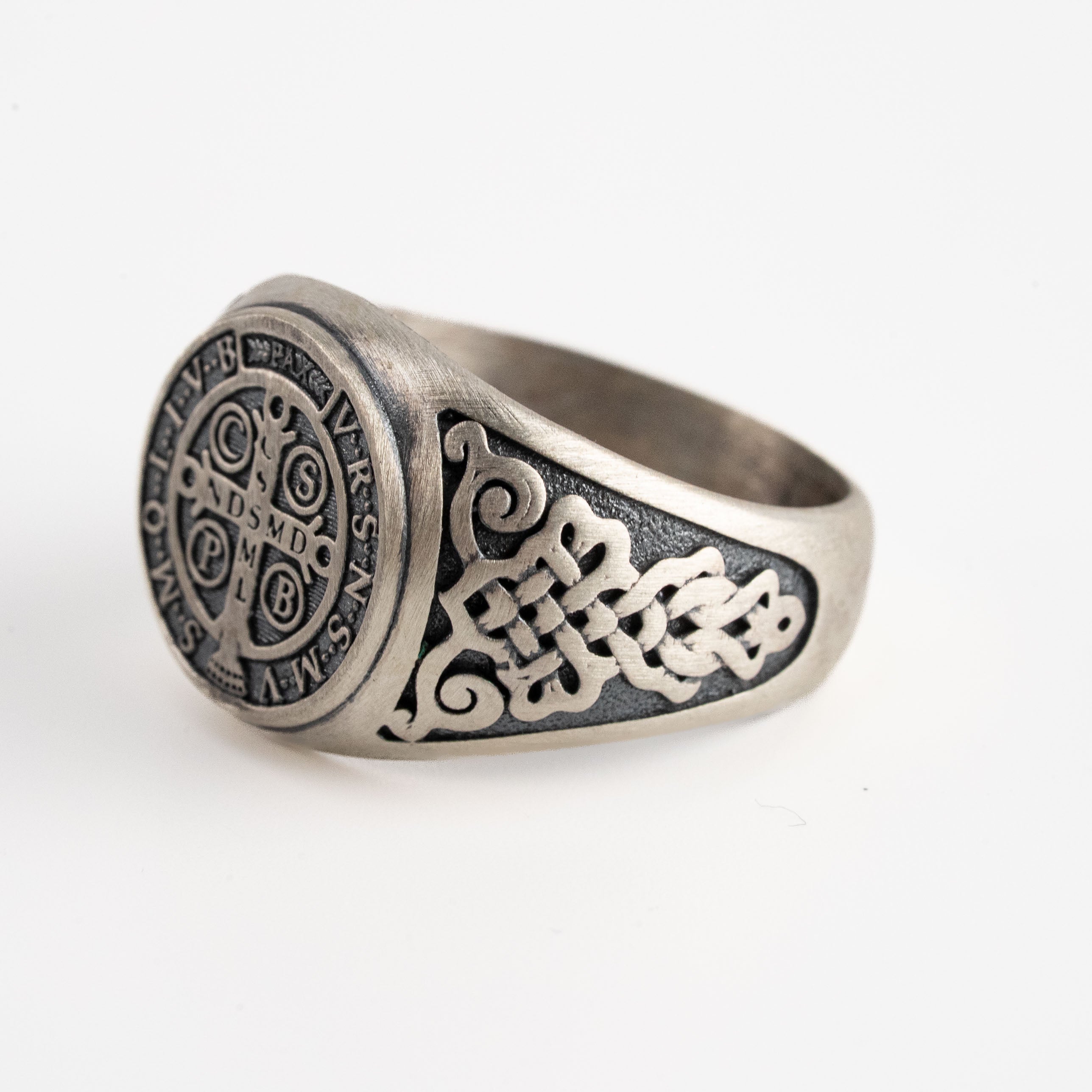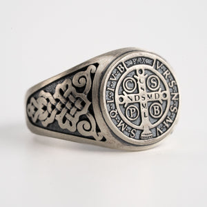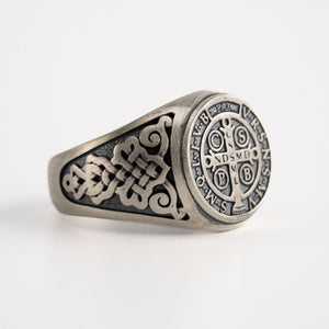 Handmade St Benedict medal signet showcasing meticulous engraving and sculpted relief, crafted in 925 sterling silver with polished and oxidized finishes for a masculine, timeless presence on the hand.