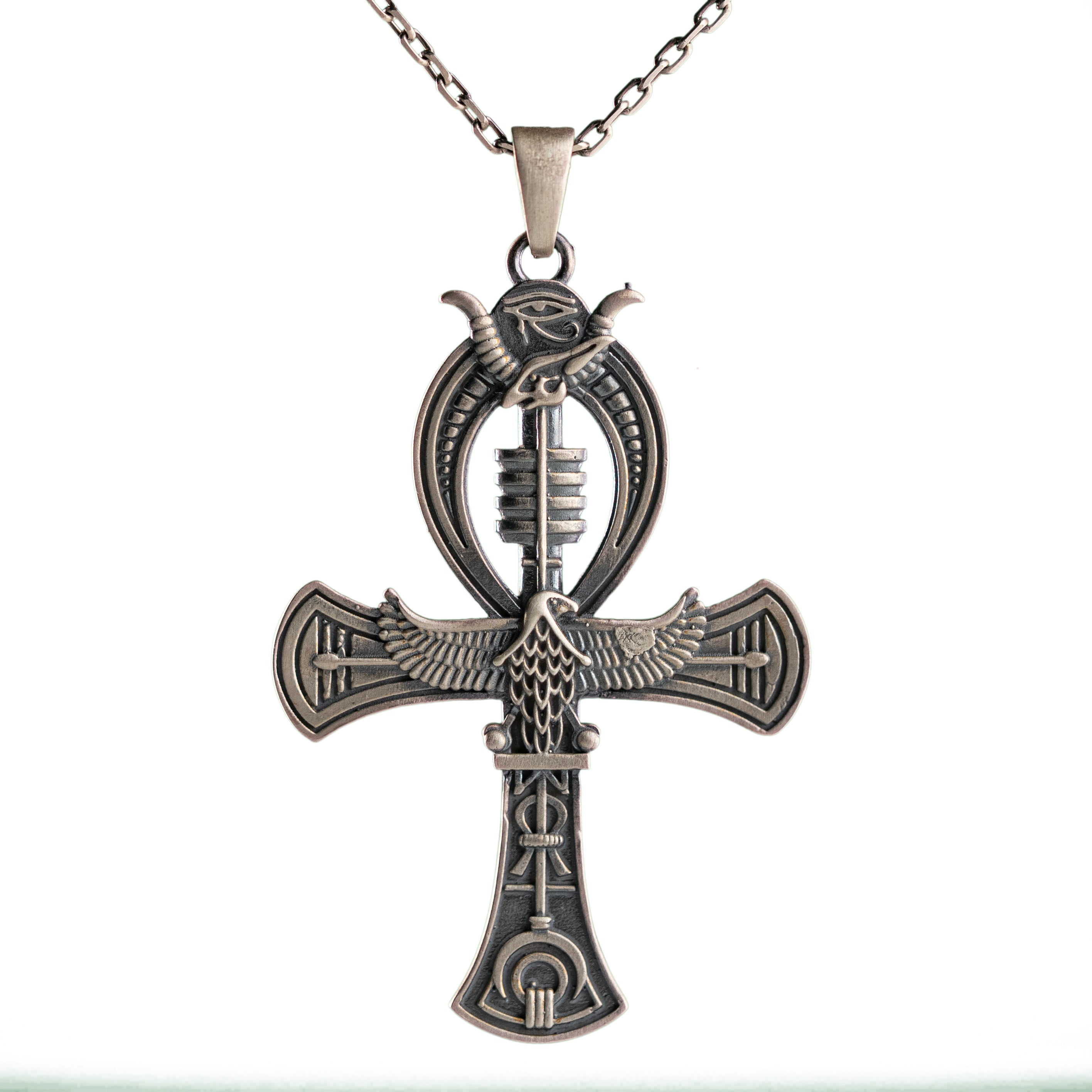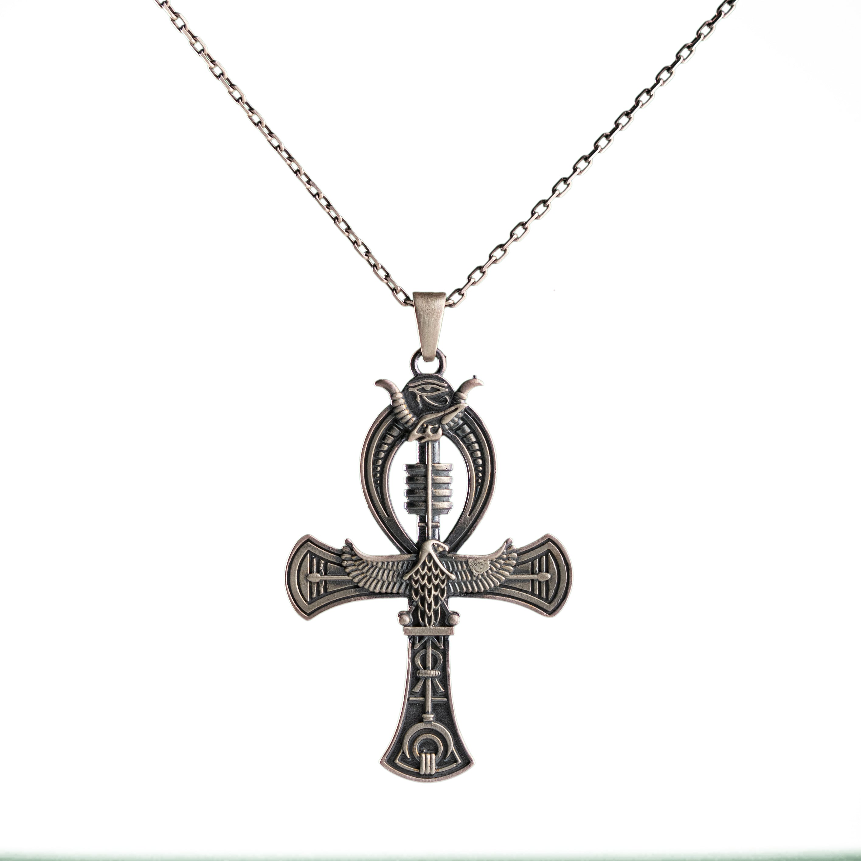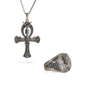 Sterling Silver Pharaoh Ring With Ankh Pendant Necklace Gothic Egyptian Jewelry